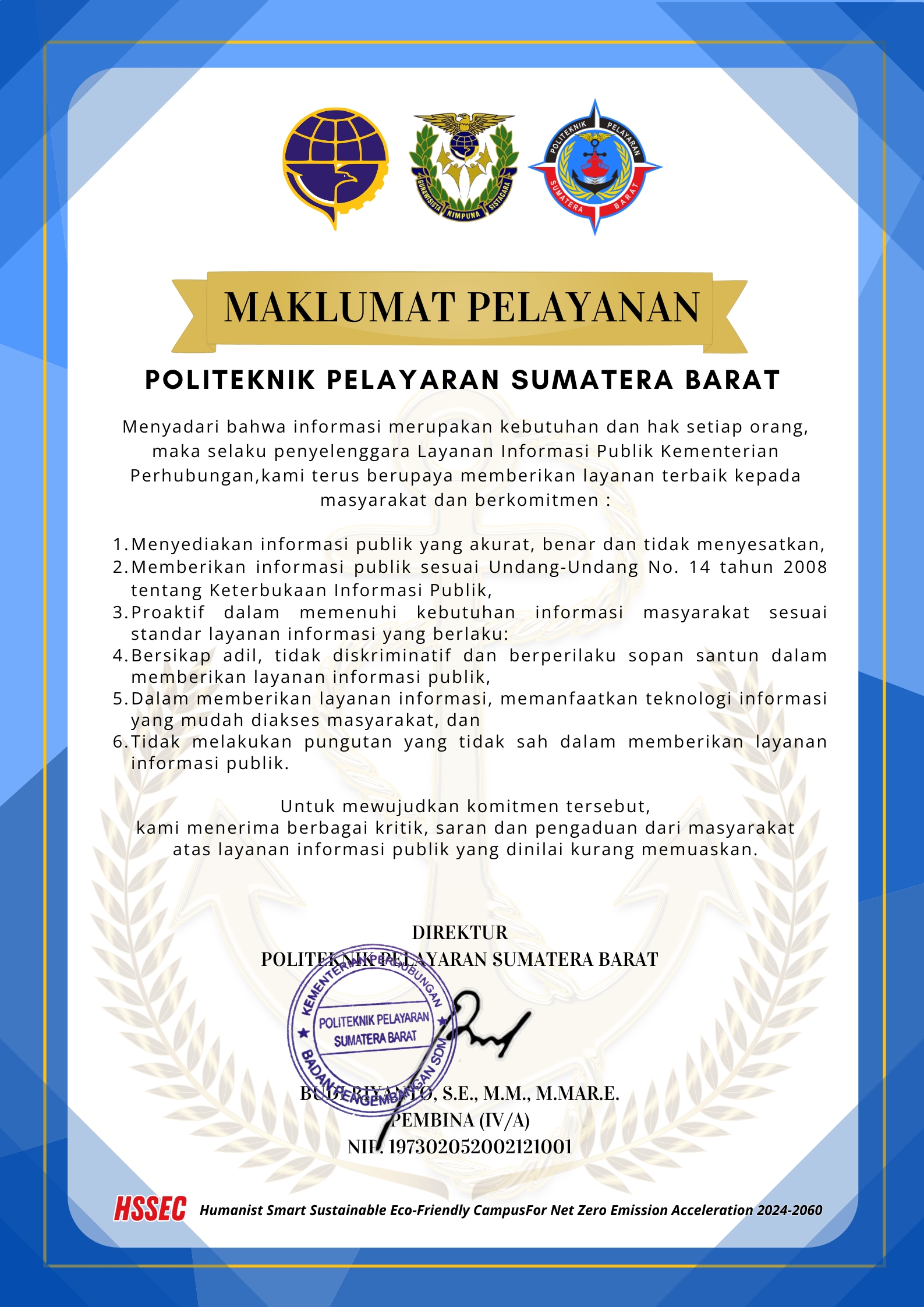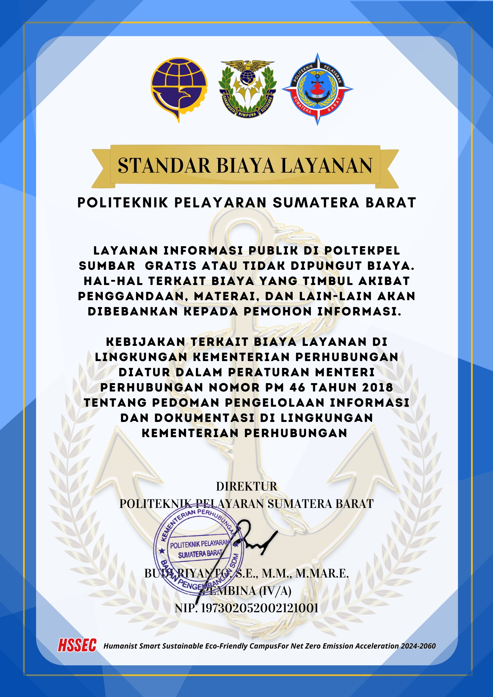 Berdasarkan KP-Poltekpel.SBR.140/II Tahun 2023 tentang Pejabat Pengelola Informasi dan Dokumentasi Pelaksana UPT Politeknik Pelayaran Sumatera Barat, dalam melaksanakan tugasnya berpedoman pada Peraturan Menteri Perhubungan Nomor PM 72 Tahun 2010 tentang Standar Operasional dan Layanan Informasi Publik di Lingkungan Kementerian Perhubungan yang kemudian diamandemen menjadi Keputusan Menteri Perhubungan Nomor KM 117 tahun 2022.