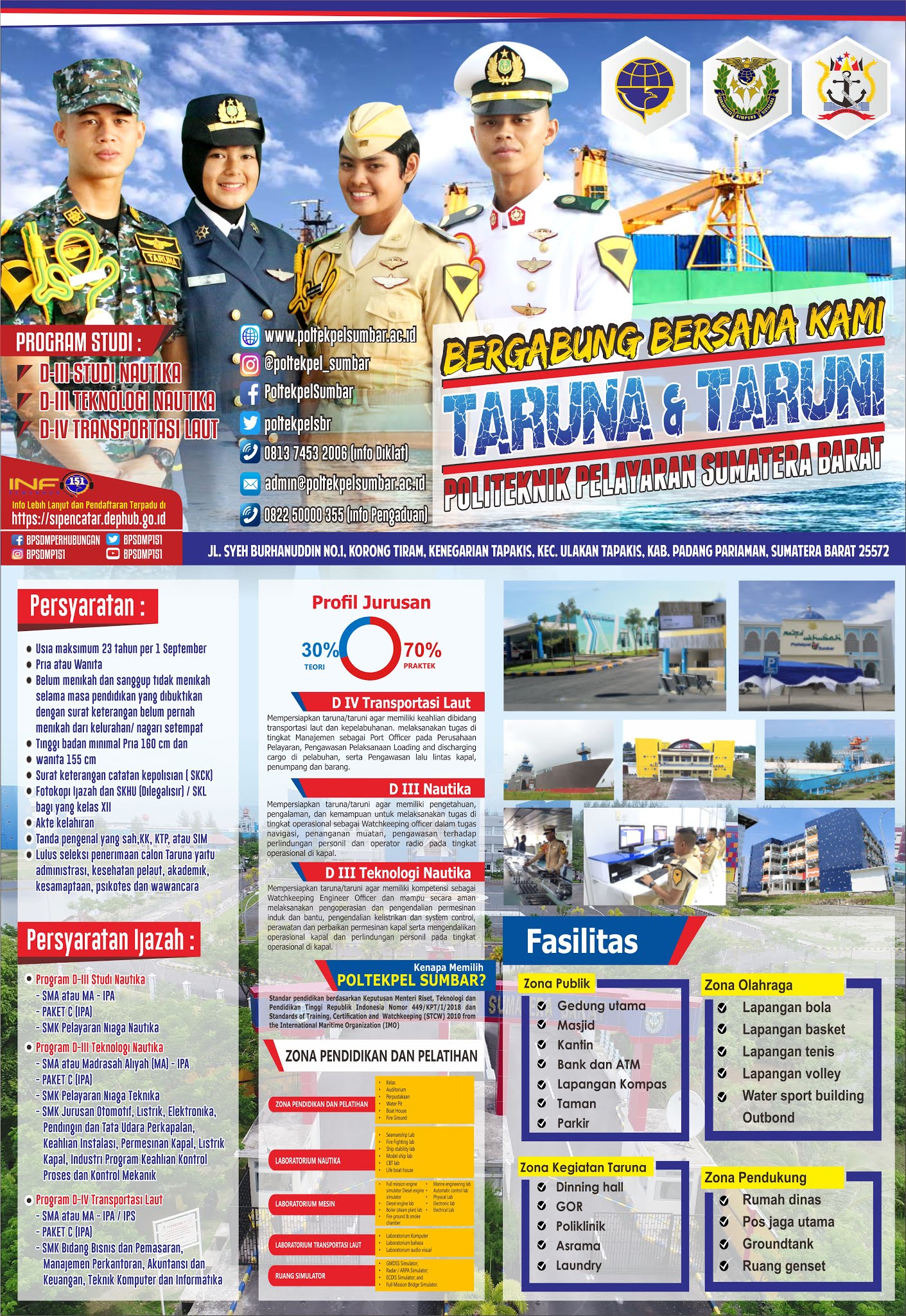 Poltekpel Sumbar membuka pendaftaran Sipencatar untuk 3 jurusan, yaitu D III Nautika, D III Teknologi Nautika, dan D IV Transportasi Laut. Berkas Pendaftaran yang harus dipersiapkan antara lain :